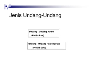 Anda bukan hanya dapat membina kerjaya dalam bidang perundangan tetapi anda akan dilatih untuk berfikir di luar kotak dan berfikir secara analitik. Secara asasnya undang-undang boleh dibahagikan kepada dua jenis iaitu undangundang awam public law dan undang-undang persendirian private law. Jika perlu dan disetujui oleh kedua-dua buah dewan.